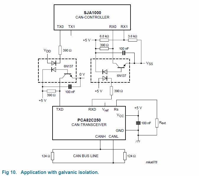 Hallo Ich habe den Optokoppler sperat auf eine Steckboard aufgebaut. a) Ich habe wiederum etwa 4 Volt an der offenen Kathode der Optokopter-LED gemessen. Das stimmt mit der vorherigen Messung (SJA1000+6N137) überein. b) Wenn ich dann über den Widerstand R1 eine Verbindung nach Masse herstelle, messe ich nur noch circa 3 Volt an der Kathode. Der Spannungsabfall über der Diode ist genug, um den Optokoppler durchzuschalten (Im Gegensatz zur vorherigen Messung SJA1000+6N137. Da waren es 4 Volt) Kann ich daraus schliessen, dass der Innenwiderstand des SJA1000 einfach zu gross ist ? Kann es sich um ein Konfigurationsproblem des SJA1000 handeln ? Nach meinem Dafürhalten habe ich das Output-Control-Register mit Push-Pull-Betrieb richtig gesetzt. Dafür spricht auch, dass die Spannung am TX0-Ausgang des SJA1000 ohne externe Beschaltung (d.h. ohne den Optokoppler 6N137) die Werte 0 Volt bzw 5 Volt annimmt. Die Schaltung für die galvanische Trennung stammt aus dem Datenblatt des PCA82C250 (www.nxp.com/documents/data_sheet/PCA82C250.pdf Bild 10 -- ich habe es ausgeschnitten und an das Posting angehängt) Viele Grüsse Tilman