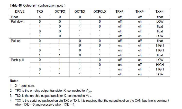 Ich habe es als PullDown probiert (OCR=0x0a). TXD floatet dann nur. Erst bei setzen des Polarität-bits (OCR=0x0e) tut sich was am Bus. Leider kommt es nun zu Kollission am Bus und es werden keine Messages übertragen. Ich habe Tabelle 48 aus dem Datenblatt des SJA1000 angehängt, das die Konfigrationen zeigt. Ganz schlüssig ist es nicht: Was bedeutet TxD ? Ist das ein logisches Signal (0=recessiv;1=dominant zum Beispiel) ? Oder ein physikalisches (1=5V;0=GND) ? Danke Tilman