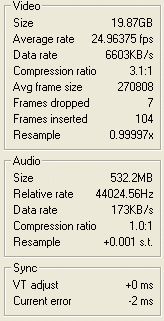 Hier noch die Anzeige von VirtualDub am Ende der Aufnahme, hatte mir das extra abgespeichert.