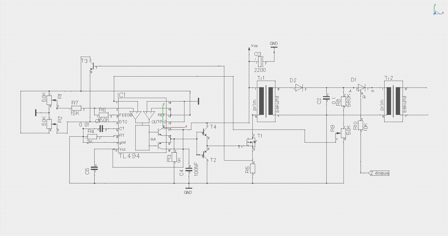 Hallo Johannes! Schaltplan, überarbeitete Version: http://wiki.rc-network.de/images/thumb/4/41/Versuchsz%C3%BCndung.jpg/800px-Versuchsz%C3%BCndung.jpg Jetzt verstehe ich auch , warum du mit der Pinangabe nichts anfangen konntest. Die Pinbelegung des Bauteils TL494 ist in Target3001 anders belegt/gezeichnet, als es real ist. Ich verwende die reale Pinbelegung wenn ich schreibe. C4 wurde nötig, weil sich im DSO Oberwellen auf dem Rechtecksignal zeigten, 0,5V.^^