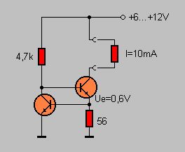 Die Schaltung ist nur nach dem selben Schema aufgebaut. Ich hab als Transistoren 2x BC850c und anstatt dem 56 Ohm Widerstand einen 33 Ohm Widerstand. Macht bei einer Basis-Emitter Spannug von 0.66 V genau 20 mA. Als Versorgungsspannung hab ich 15 Volt dran. Ab ca. 5 V leuchtet die besagte LED mit voller Helligkeit und es fliessen auch 20 mA Strom . Bis 30 V ändert sich nix an der Helligkeit und Strom.