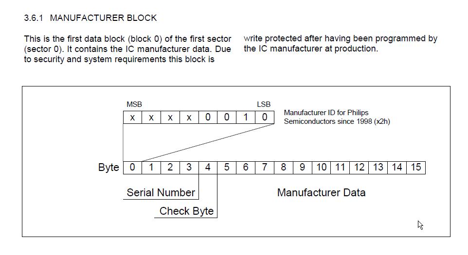 Hallo, Mifare RFID Karte- Entschlüsselung Manufacturer Block ? Kann jemand die genaue Aufschlüsselung diese Bytes? Datum, Kartentype (1K/4K) Prod. Ort etc. ?? Wo kann ich diese Finden? mfg Roger