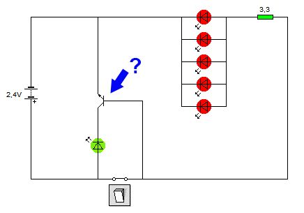 Hello, ich hab n Fahrrad Rücklicht auseinander genommen um mir bei der Schaltung was abzugucken (siehe Anhang). Die grüne LED leuchtet solange wie die Batterien (2 x 1,2V (AAA) = 2,4V) noch ausreichend geladen sind, also je nach Ladungsstand wird das Leuchten immer schwächer. Das Teil wo das Fragezeichen beisteht sieht aus wie ein normaler Transistor (http://www.reuk.co.uk/OtherImages/labelled-transistor.jpg), ich hab im Schaltbild mal angenommen dass es n NPN Transistor ist, weil ich nicht weiß wie ich das messen soll wenn ich ihn nicht aus der Schaltung rausnehmen kann. Aber müsste dann nicht vor der Basis ein Widerstand sein? Deswegen jetzt die Frage, wie funktioniert die Schaltung und was ist das für ein Bauteil in der Mitte und was macht es? Vielen Dank schonmal im Voraus! (bin neu hier und auf einmal total elektronisch begeistert :D) Jex
