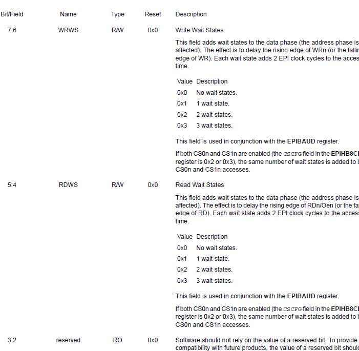 Die wait states sind bei der Beschreibung der Einstellungsregister beschrieben. Allerdings wird da keine Angabe über das übrige Timing gemacht. Ich hab jetzt das EPI Kapitel sicher 3x gelesen und es sind immerhin 80 Seiten :) Kann das evtl noch irgendwo stehen? Eine Suche im Dokument nach wait states und timing diagram hat auch nicht sinnvolles ergeben