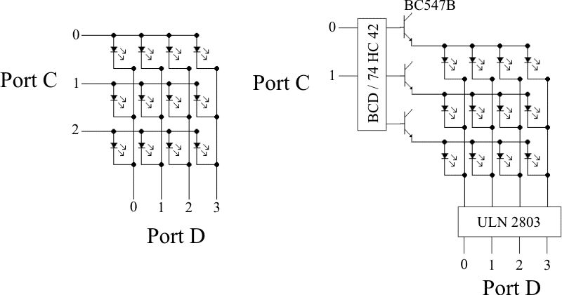 @Peter: ja, der MC schafft nicht mehr als die dann maximal fließenden 60mA. Die Schaltung habe ich gerade mal aufgezeichnet. Das Array ist jedoch größer, momentan 8x8 LEDs. Links der Ist-Zustand, rechts das, was ich mir vorstelle. Ich würde mich freuen, wenn jemand mit etwas mehr Ahnung als ich da sein OK dazu geben könnte oder Verbesserungsvorschläge. Außerdem interessiert mich, durch welchen IC man die vielen einzelnen Transistoren ersetzen könnte.
