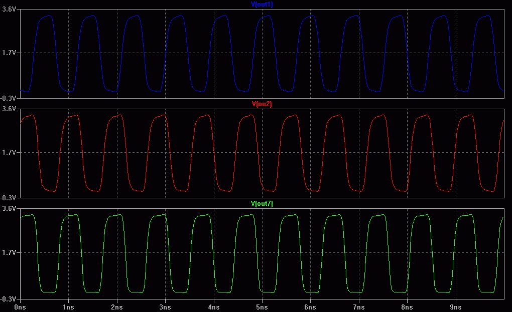 Weil es so schön paßt, hier mein Beitrag. Hatte vor einigen Tagen zufällig was mit Ringoszillator gemacht. Das Ergebnis ist von Jim Thompson (altgedienter Chipdesigner) als plausibel deklariert. 0,35um ist in etwa die Klasse LCX, also 3,3V Gatterlaufzeit ca. 90ps! Und eure AC-Typen ist so ca. 0,6um Einstellige Ringoszillatoren sind übrigens Blödsinn. Man nimmt mindestens 3, besser noch viel länger, so um die 20 Stufen. Wenn es ganz toll sein soll, dann ist die Stufenzahl eine Primzahl. Gibt ein nettes Paper bei IEEE dafür. In realen ICs kommen noch starke Ausgangstreiber und Schutzbeschaltung hinzu! Keep on basteln - Abdul