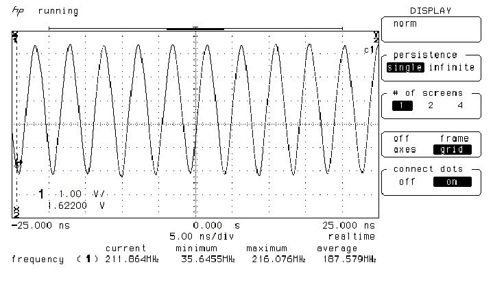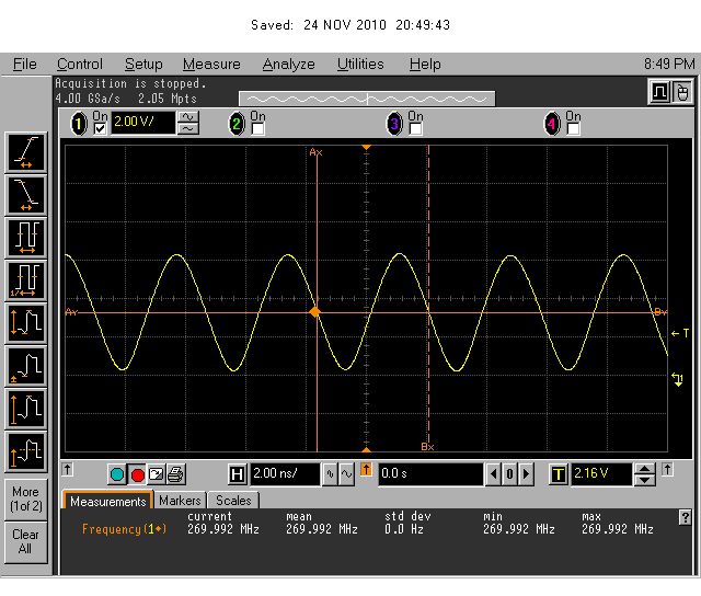 Ich leg' mal noch einen oben drauf: selber Aufbau wie oben, nur 6.5V statt 5V T=1.6nS -> 625MHz Die Triggerung wurde dabei dermaßen instabil, dass ich im Speichermodus im richtigen Moment 'Save' drücken musste, um ein für die Kamera brauchbares Bild zu erhalten. Daher auch die Unschärfe.