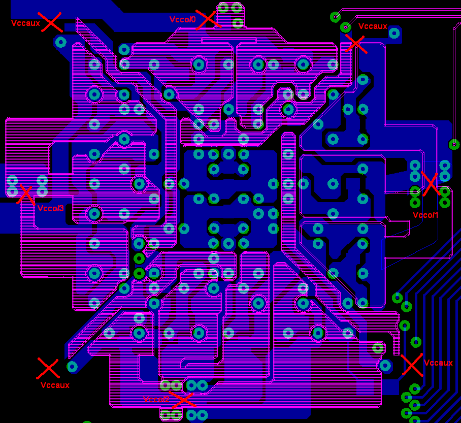 Ok, im Anhang also mein bisheriger Entwurf. Die ersten beiden Bilder geben einen Überblick über den Aufbau. Das dritte Bild zeigt beispielhaft den Aufbau einer einzelnen Bank. Es bedeuten: Blau = Bottom-Layer türkis = Zwischenlayer unten pink = Zwischenlayer oben. Den Top-Layer habe ich weggelassen, da von dort lediglich die Vias zum Bottom-Layer führen. Ich meinen Entwurf wie folgt aufgebaut: - Alle Versorgunspins gehen über Vias direkt auf die Unterseite der Platine. - Die Versorgungspins einer Bank sowie von Vcc_aux und Vcc_int habe ich in Gruppen zusammengefasst. - Jede Gruppe wird von mehreren 470 nF Kondensatoren gestützt (Anzahl: siehe Design Guide UG393), die ich innerhalb des Footprints platziert habe. - Um eine geringe Induktivität zu erreichen, habe ich direkt auf dem Bottom-Layer um jeden dieser 470 nF Kondensator eine Insel von Vcc und GND erstellt. - Diese Inseln werden vom 4,7 µF Kondensator gespeist. GND wird dabei ebenfalls auf dem Bottom-Layer geführt, Vcc kommt über die Vcc-Plane. - Der 4,7 µF Kondensator sitzt natürlich ausserhalb des Footprints und ist noch nicht eingezeichnet. Was haltet ihr davon? Was ist gut, was schlecht? Hat jemand von Euch eigentlich ein funktionsfähiges Beispiel-Layout? Grüße Steffen