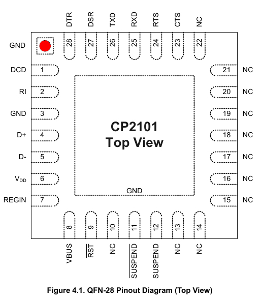 In der neuesten Version des CP2102 dient das Quadrat, falls vorhanden, nur als PIN1 - Erkennung (S. 9 von Datenblatt V1.4). Bei den älteren Versionen war das noch ein zusätzlicher GND - Pin (Datenblatt V1.1).