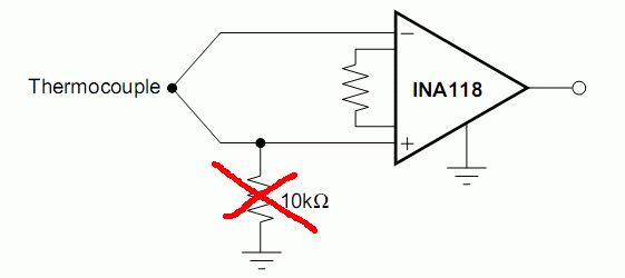 Die Temperatur wird wahrscheinlich in den Impulspausen gemessen. Der OPV gehört eigentlich wie Jörg gesagt hat dual versorgt, da dein Thermoelement bereits einseitig an GND liegt. Die Schaltung mit den 10k stammt aber aus dem Datenblatt. Das passt nicht zu dieser Aussage aus dem Datenblatt des INA118 (TI): Linear Input Voltage Range min. (V+) –1V typ. (V+) –0.65V min. (V–) +1.1V typ. (V–) +0.95V Das gute Stück ist damit nicht Rail-to-Rail fähig! Wahrscheinlich soll diese Schaltung nur das Prinzip der Ableitung des input bias currents zeigen. Deine gemessene Thermospannung ist komisch. In diesen Bereich liegen die Typen C und D, die sind für Temperaturbereiche bis 1800°C und 2100°C geeignet... Beziehen sich die 1,5 Ohm auf den kalten Lötkolben? Wird das ev. bei Erwärmung mehr?