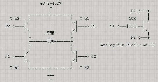 Laut meine Betrachrung sind die Leistungstransistoren im Schalterbetrieb der Steuertransitor aber nicht. Auf ihn habe ich auch die Aussage mit dem Arbeitspunkt bezogen.(Finde die 10kOhm sind fürn Schalterbetrieb (um ihn in Sättigung zu treiben) zu hoch) Aussserdem muss der Ib ja nur soweit begrenzt sein das die Leistungstransistoren nicht thermisch Zerstört werden. Das der ganze dreck Streut und das das alles absolut schwammig ist weiss ich...! Aber naja sagen wirs mal so als ich noch nicht das nötige wissen hatte hab ich auch solche Späße gebaut... und jetzt nach gerechnet funktionierts grade so an der absolut Grenze xD. Ist alles ne Sache des glücks :) Mfg, Rising