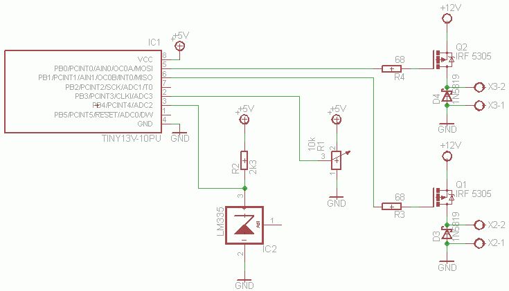 Moin zusammen! Die Heizgriffe meines Motorrades können in zwei Stufen umgeschaltet werden: lauwarm und kochend heiß. Ich möchte gerne eine stufenlose Regelung dafür bauen. Nach einiger Suche im Forum und den Artikeln habe ich obige Schaltung entworfen. Die Regelung erfolgt über einen Tiny13 mit 1-2 Hz per Software PWM. Das Poti R1 dient über einen analogen Eingang zur Regelung der Heizleistung. Der LM335 erfasst die Lufttemperatur zur automatischen Anpassung der Heizleistung, so spare ich mir das ständige Nachstellen, wenn man z.B. über einen höheren Berg oder Pass fährt. R2 mit 2300 berechnet sich aus (5V-2.7V)/0.001A. An X2 und X3 werden die Heizgriffen angeschlossen. Ich regel beide getrennt, da der Gasgriff immer etwas wärmer wird und ich den Unterschied kompensieren möchte. Die IRF5305 sind zwar etwas überdimensioniert, aber passendere habe ich nicht gefunden. 1N5819 ist die Freilaufdiode, R3 und R4 sollen laut Artikel hier zwischen 50 und 100 Ohm haben, ich habe noch 68 Ohm Widerstände vorrätig, also habe ich diesen Wert genommen. Meine Spannungsversorgung für 5V ist praxiserprobt und deswegen hier nicht extra aufgeführt. Meine Frage an die Experten: Kann das so funktionieren oder habe ich offensichtliche Fehler eingebaut? Danke für eure Hilfe! Parker