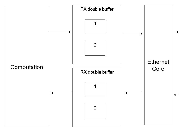 Hallo, ich habe einen double buffer auf einem Virtex5 FPGA (XUPV5-LX110T Board) mit Block RAM realisiert. Die grobe Struktur des Design ist im angehängten Bild zu sehen. Über Ethernet werden Bilddaten empfangen und in einem frame buffer gespeichert. Wenn ein komplettes Bild empfangen wurde, wird der double buffer umgeschalten und es kann das nächste Bild empfangen werden. Parallel dazu kann die Berechnungseinheit das letzte Bild verarbeiten. Das Senden funktioniert analog. Aus Platzgründen möchte ich den externen DDR2 SDRAM verwenden, befürchte aber, dass mir die double buffer Struktur hier gar nichts mehr bringt. Ist das so? Der einfache Memory Controller, den ich mit dem MIG Core Generator erzeugen kann, hat ja nur ein Interface zum Speicher. Eine Alternative ist der MPMC, mit dem ich mehrere logische Interfaces erzeugen kann, die aber nur durch eine Arbitrierung das gleiche physikalische Interface verwenden, richtig? Das sind momentan die Möglichkeiten, die ich ausgemacht habe - hat jemand noch einen Tipp für mein Problem? Oder muss ich eben mit einem einzigen Interface leben? Grüße, Sebastian