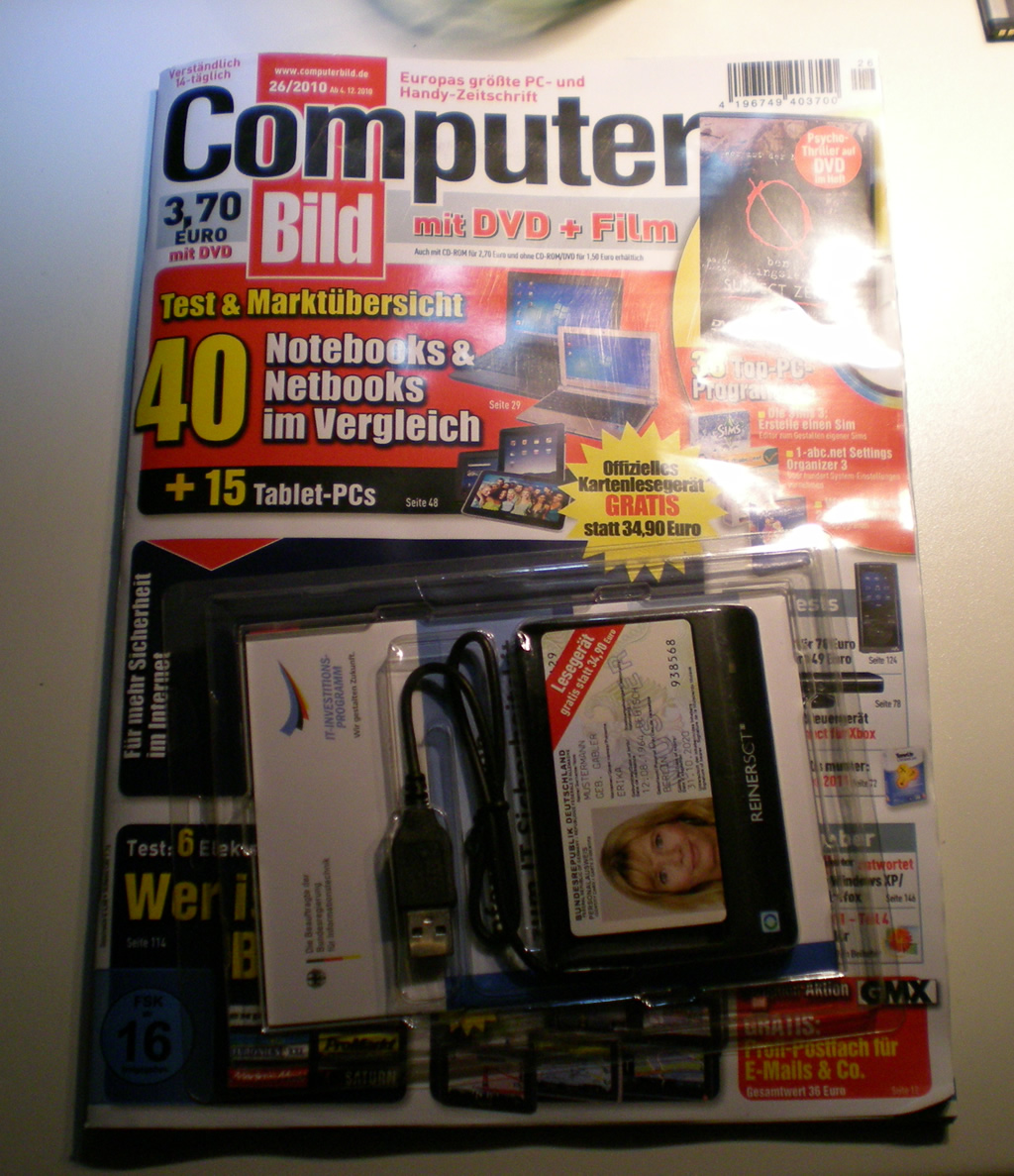 Moin! Die fachliche Kompetenz dieser "Zeitschrift" lassen wir mal dahin gestellt, aabbeerr seit heute gibt es diese Zeitschrift mit einem RFID Kartenlesegerät für den neuen Personalausweis und das für nur 3,70€ na wenn das mal nichts ist? Da kommt auch noch eine kleine RFID Karte mit dazu um das Ding zu testen! Bilder anbei! Hamburg Niendorf hat noch genug Zeitschriften (Niendorf Nord die beiden Zeitschriftenläden + Tibarg-Center) Auf auf Leute ;)