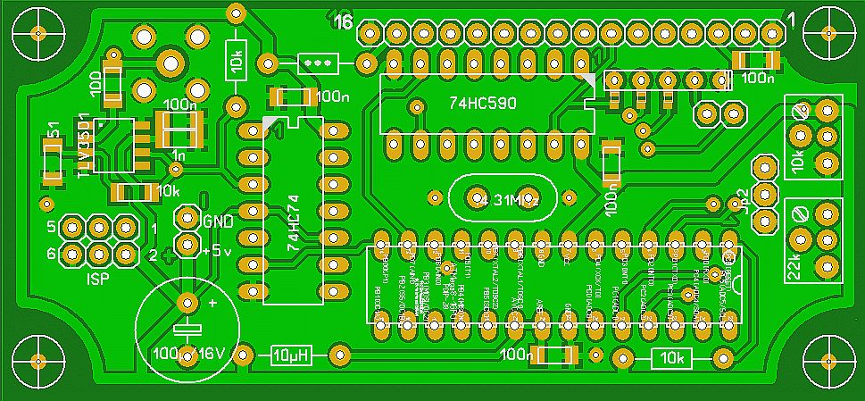 Hardware steckt drin: 1xATmega8, 1x74HC74, 1x74HC590, LCD 10x1.