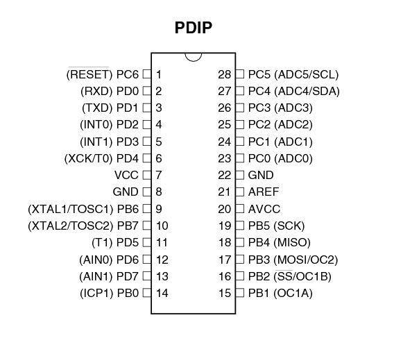 Im Anhang das Pinout aus dem Datenblatt... > Reset mit einem 100M Widerstand auf +5V Aussergewöhnlich. Normalerweise nimmt man da so 10 KOhm. > AREF auf +5V, Externe Spannung auf AREF ist keine gute Idee. Eine Fehlkonfiguration der Referenz des ADC und das wars. Verbinde AREF nur über einen 100nF Kondensator mit AGND. Die +5V für AREF kannst du prima über die interne Referenz auf den ADC schalten. Wie steht im Tutorial. > und ein Poti (1MOhm linar) zwischen AREF und 0V mit > Mittenabgriff auf ADC0 der vom ADC eingelesen werden sollte... Ähm. Wenn du eine Spannung gegen AREF messen willst, dann sollte die Schaltung nicht AREF beeinflussen. Ich würde das Potentiometer nicht an AREF hängen. Das 1 MOhm ist viel zu hochohmig. Nimm ein 10 oder 22 kOhm Poti. 100 nF Abblockkondensatoren zwischen Vcc/GND und AVCC/GND und AREF/GND sind sehr zu empfehlen. AVCC (pin 20) muss auch Saft bekommen! Quellcode habe ich nicht groß angesehen, weil mich die exotische Schaltung "gefesselt" hat. Mich wundert aber, dass die LED an OCR1B (Pin 16) hängt im Programm aber mehrfach ...A (OCR1AH/L, COM1A1) benutzt wird.
