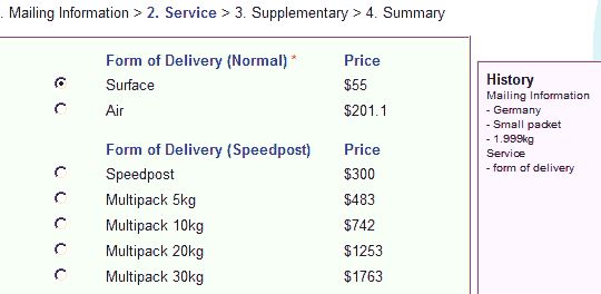 Hier als Bild, sieht schlecklich aus, aber es sind keine US-Dollar, sondern HongKong Dollar, also grob geteilt durch 10, also 5 EUR 50 für 2kg nach Deutschland. Und nein, so unzuverlässig, wie manche gerne jammern, ist die Post da auch nicht, üblicherwese kommt das Zeug in weniger als 1 Woche an. Ja, wer falsches Management betreibt und es in 2 Tagen braucht, der darf teuer Express bezahlen.