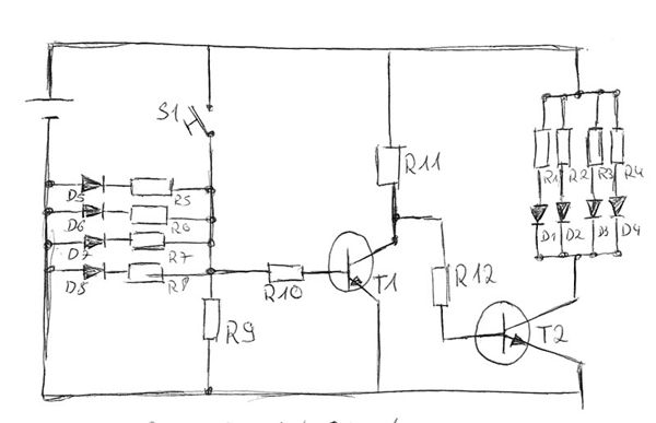 Und wenn Du für S1 einen Umschalter nimmst, kannst Du Dir sämtliche Transistoren und die damit verbundenen Widerstände sparen!