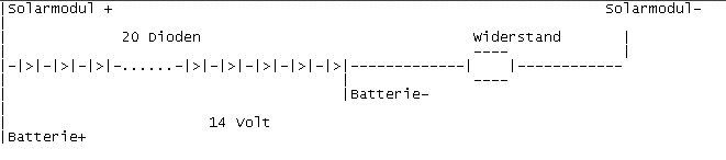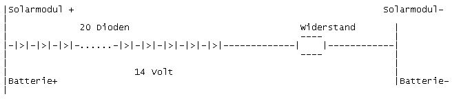 Hallo zusammen Bastel schon seit einiger Zeit an einem Solarladeregler für einen 60 Ah Bleiakku der in meiner Garage steht für Garten LED Beleutung Hatte schon einen PB137, hat leider 100 mA verbraten obwohl alles lt Datenblatt. Dann hab ich Powerz-diode als Shuntregler da bricht mir die Spannung auf 2 Volt weg (der Spannungsteiler friesst anscheinend zuviel) Jetzt hängt der Akku direkt am Modul und siehe da er wird geladen... Sind in einer Stunde schon 0,05 Volt !!!!!! (keine Sonne) Jetzt könnt ich noch 3 x 4,7 Z-Diode in Serie aber 45 Watt...ne 20 Dioden in serie siehe Bild ??? Kann das überhaupt funkionieren, hab das mal wo gelesen...