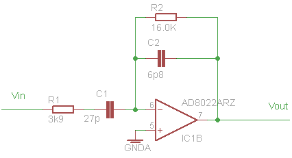 In diesem Frequenzbereich sollte weder eine Signal-Amplitude von 10V angestrebt, noch die Beschaltungswiderstände des AD8022 derart groß gewählt werden. Ich würde ein passives Filter, also beispielseise die Annordnung C-R-R-C, am Eingang eines nicht-invertierenden Verstärkers vorziehen, weil dabei die Gegenkopplung weitgehend reell bleibt, was enorm der Stabilität zu Gute kommt. Bei mehreren solcher Bandpäße in Serie begrenzt der passive Bandpaß immer auch das Rauschen der vorhergehenden Stufen, sodaß das Rauschen letztlich relativ klein bleibt. Kai Klaas