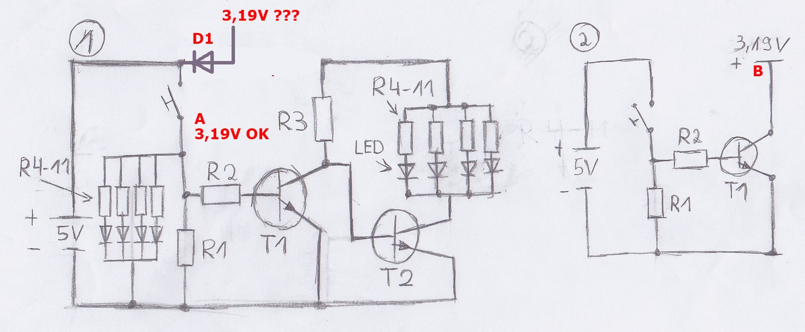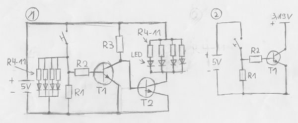 Danke erstmal für die schnelle Antwort. Kann nicht sagen ob das eine Spannungsquelle ist. Will die Technik in einen Arcade Stick bauen, so das wenn ich einen Button betätige die beleuchtung von weiß nach Blau ändert. Hierzu baue ich eine Platine aus einem anderem Stick ein. Die 3,19 V kommen aus dem Chip der Platine auf den Button. Wird der Button betätigt, so werden die 3,19 V mit der Masse verbunden, und der Chip führt die gewählte Aktion an der Konsole aus. Da der Arcade Stick insgesamt 10 Buttons hat, benötige ich die Schaltung, Schaltplan 2 10X. Besteht nach Plan 1 die Möglichkeit die 3,19 V ohne die Transistorschaltung, Plan 2, auf Masse zu Leiten? Danke für eure Hilfe!