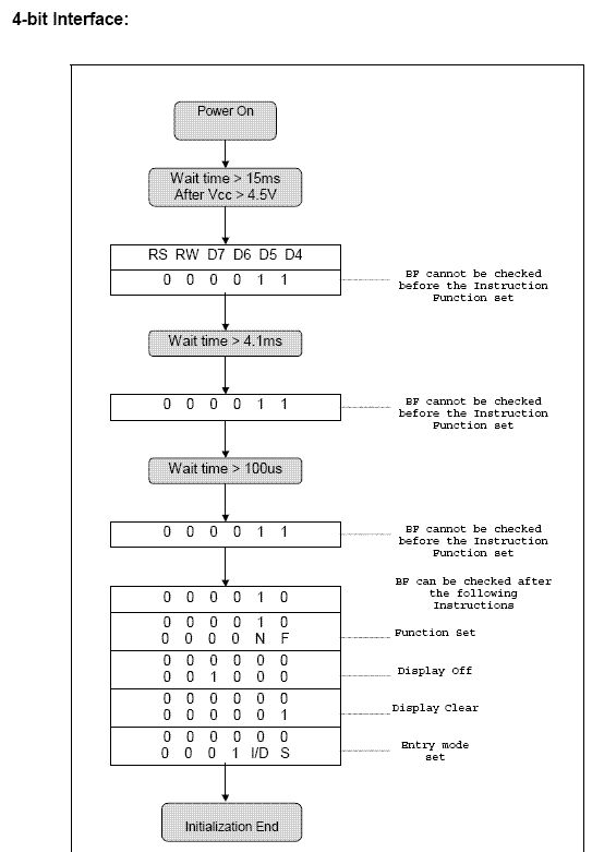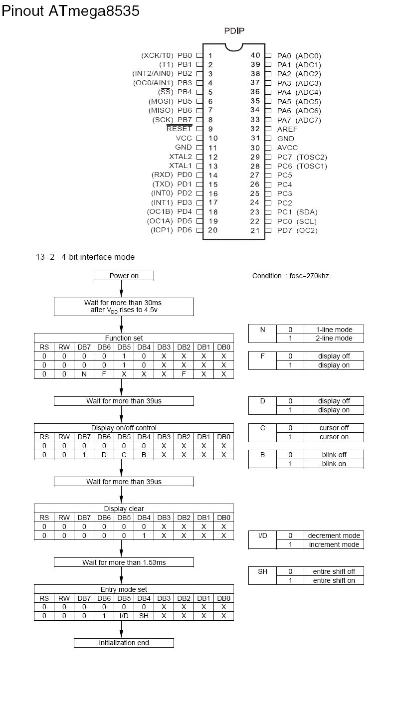 hmm. tatsache! da liest das display wohl bei der fallenden flanke von enable. bei der initialisierung auf 4bit-breite sind die unteren 4bit egal, oben durch 'X' dargestellt. die kannst du sozusagen unverändert lassen und nur enable takten. du hast recht mit dem 3x senden, da tuste 4x enable takten und hast somit 2x 8bit übertragen-> die 1. und 2. Zeile für FunctionSet. das mit dem 3x senden ging wohl nur darum, das display aus jedem modus heraus sicher auf 4bit umzuschalten egal ob es selbst grad auf 4bit steht (und zum beispiel zwischen oberen und unteren nibble). ich meinte mit dem datenbusanschluss die displayseite - db7-db4. also die obere hälfte ;-) den rw-'ausgang' am prozessor musst du so einstellen dass das display daten liest. denn wenn du auf daten senden stellst (z.B. busyflag auslesen), dann treibt das display selber die datenleitungen ... und das ist nicht so gut für alle beteiligten.