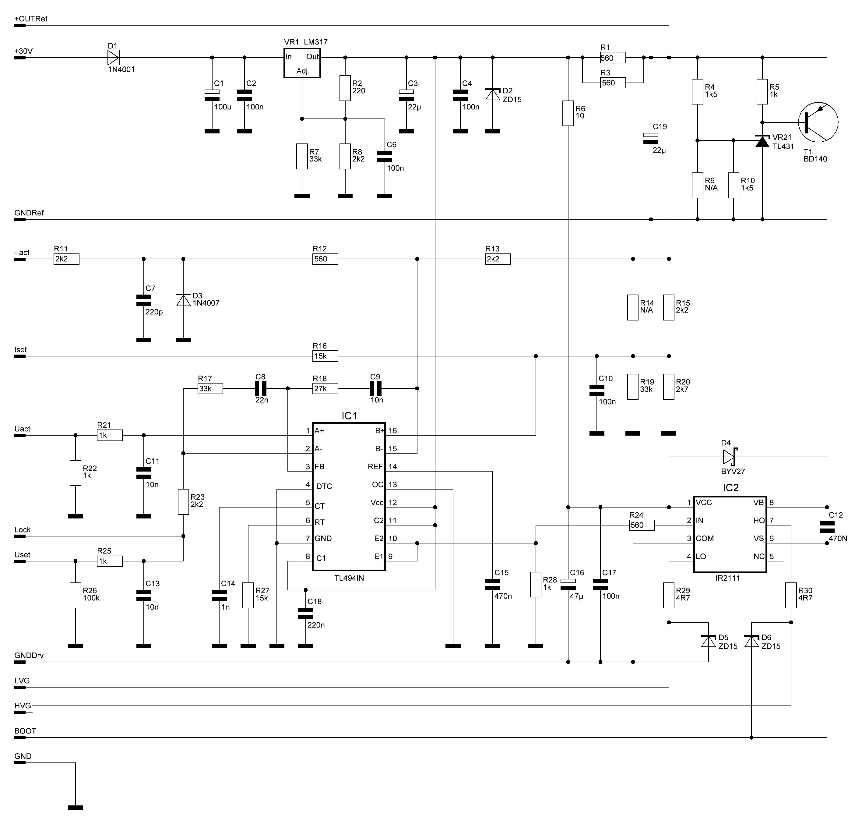 Hallo Gerhard, vielen Dank fürs hochladen der neuen Version. Beim durchgehen der Schaltungen ist bei mir die Frage aufgekommen ob man die Hilfsspannungen anstatt mit dem 24V Regler und Z-Diode vielleicht mit Hilfe der Mittelpunktsanzapfung und zwei Spannungsreglern erzeugen sollte. (Chris hatte das in seinem Boardlyout so umgesetzt.)