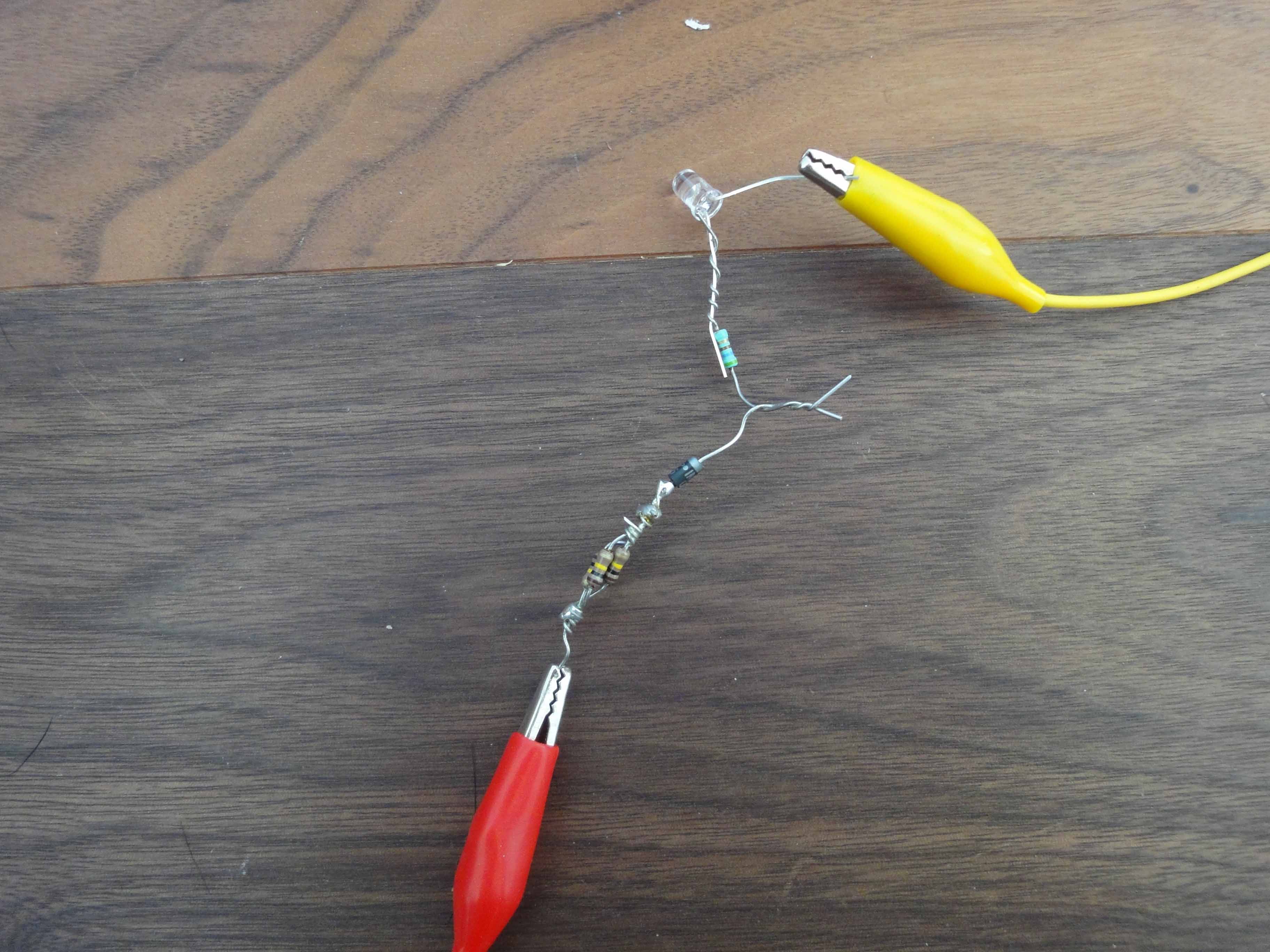Der Trafo muss mit einer Sicherung abgesichert werden. Die Widerstände sind viel zu hochohmig. Die gelbe Krokoklemme kannst Du direkt an den schwarzen klemmen (eine Diode reicht).