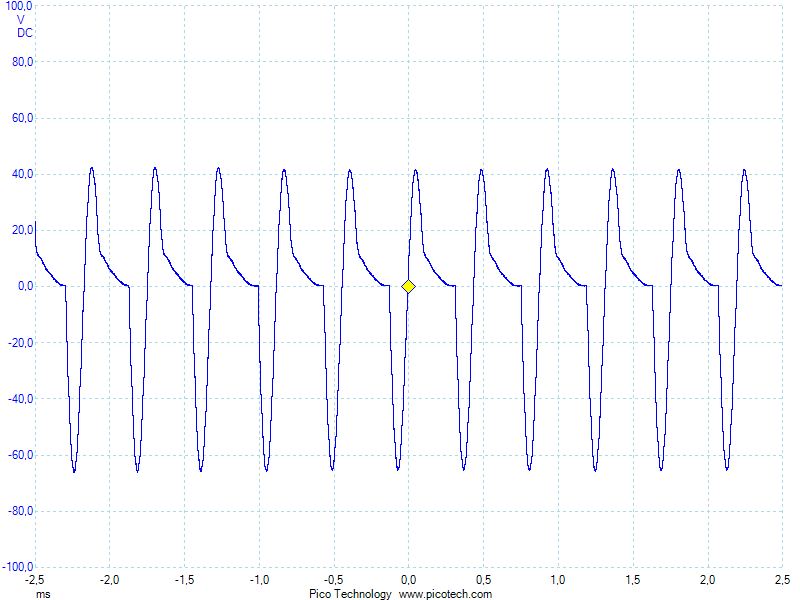 So, jetzt ist etwas Zeit vergangen, aber dafür hatte ich Gelegenheit ein Oszilloskop zu verwenden. Mein Piezo-Treiber-Signal ist in beiliegendem Bild dargestellt. Für mich sieht das relativ rechteckig aus. Ich habe es mit dem am Thread-Anfang dargestellten Aufwärtswandler generiert. Die Lautstärke ist schon ganz gut, aber von einem Alarm wünsche ich mir mehr. Jetzt würde ich gerne so ein Signal generieren, wie es die Tür- und Fensteralarme machen (siehe Bild). Diese Alarme sind nämlich noch lauter als meiner. Was für eine Schaltung verwendet man dafür? Ich könnte mir eine Kombination aus Aufwärtswandler und Inverswandler vorstellen, weiß aber nicht wie die konkret aussehen soll. Wenn ich es richtig verstanden habe, ist das Tür- und Fensteralarm Signal besser für das Piezo, weil es vermutlich keinen DC-Anteil hat. Die Peak-to-Peak Spannung halte ich für etwas hoch. Mein Piezo verkraftet laut Datenblatt 30 Vpp. Weiß nicht ob es den SPL deutlich verringern würde wenn die 30Vpp eingehalten würden. Andererseits ist die Belastung durch die ca 100Vpp auch nicht so hoch wie bei einem Rechtecksignal. Also wenn mir jemand einen Denkanstoss für eine einfache Treiberschaltung geben kann, welche dieses Signal erzeugt, wäre ich sehr dankbar!