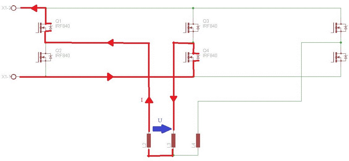 Ist Q4 und Q2 eingeschaltet, baut sich ein Strom in der Induktivität auf. Schaltet dann Q2 ab und Q1 ein, so fließt dieser Strom weiter über den Zwischenkreis. Die Schhaltung kann damit rückwärts als Hochsetzsteller arbeiten.