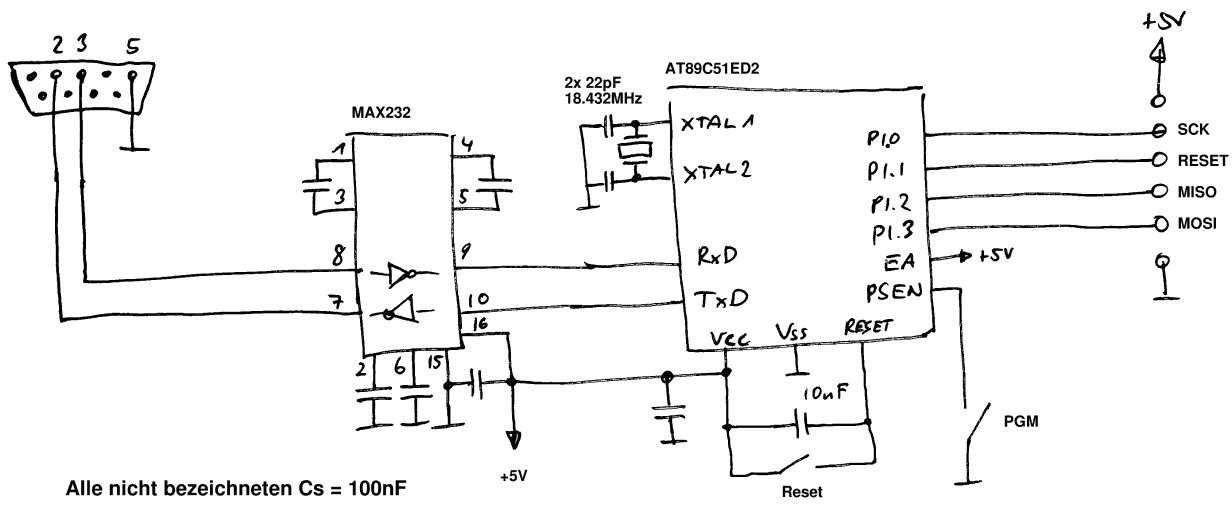 Also, bleibt bei der Variante. Hättest Du AT89S52 rumliegen, hätte ich noch eine Alternative. In diese Schaltung kannst Du nun also dieses HEX-file flashen und dann damit Deine AT89S51 (oder auch AT89S52) flashen. Dir sollte aber klar sein, daß dieser uC wesentlich leistungsfähiger ist als der AT89S51. Ach ja: Es ist eine DB9-Buchse! Gruß Jobst