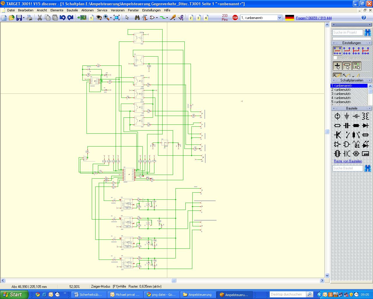 Hallo Heinz Horst! Die Schaltung bzw. die Platine ist ein Prototyp für den Eigentest. Die endgültige Platine wird erst nach korrekter Funktion unter Einbindung aller Vorschriften entworfen. Wo du Recht hast, ist das dies mein erstes Projekt mit einem PIC Prozessor ist !!!!!!!!!!! Genau das sind eben die Fragen was man bedenken muss um einen korrekt funktionierenden PIC zu Haben. Es geht mir nicht darum ob jetzt die Platine schon den Vorschriften entspricht oder nicht denn wie gesagt es ist eine Testplatine. Nur Hinweise, wie die von TK zb.sind wirklich hilfreich (empfindlichkeit der PIC Versorgung, Hinweis auf 100nF Kondensator bei VDD usw.)welche darauf abzielen was für den PIC wichtig ist. Auch Fehler in der Schaltung oder der Platine welche für die Funktion des PIC wichtig sind sind mir wichtig. Hinweise welche den Ampelausgang betreffen, sind zwar nett gemeint bedürfen aber keiner Hilfe, Danke. !!! Also bitte noch einmal: DIE PLATINE IN DER FORM IST NICHT FÜR DIE SERIENPRODUKTION GEDACHT SONDERN DIENT LEDIGLICH DAZU DIE FUNKTION DES PIC ZU ERPROBEN UND NUR FÜR DEN EIGENGEBRAUCH!!! Kritik wird natürlich gerne angenommen, nur sollte der Kritiker auch wissen was er kritisiert und nicht gleich pauschal ein Urteil fällt. P.S: Hab die Steuerung die nicht richtig funktioniert bei unserer Tiefgarage eingebaut, wo die Tastleitungen ca. 100m lang sind und neben Spannungsführenden (230V~)Leitungen verlaufen. Die exakt gleiche Steuerung hab ich jetzt paralell auch auf dem Prüfstand mit direkt angeschlossenen Tastern und Lapen angeschlossen und se Funktioniert ohne Probleme egal wie die 230V~ Versorgung für die Lampen angeschlossen ist. Kann es sein das die Eingänge des PIC empfindlich sind gegenüber Induktion durch die 230er Leitung, neben der Tasterleitung an den Eingängen? Normalerweise ja nicht möglich durch den vorgeschalteten OPTO, aber ist nur eine Theorie von mir. Lg ichael