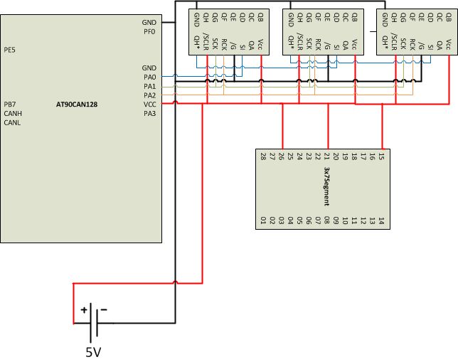 Hallo Leute, ich hoffe ihr könnt mir helfen. Ich habe 4 Dateien Angehängt. 1. Schaltplan: AT90CAN128 + 3 Schieberegister + 3fache 7Segmentanzeige 2. BC56-13SURKWA_Ver1290387772: Datenblatt der 3fache 7Segmentanzeige 3. AT90CAN128.pdf: Datenblatt der Mikrocontrollers Electrical Characteristics: Seite 365 4. 155762-da-01-en-LOGIK_IC_M74HC595B1R_STM: Datenblatt der Schieberegister Wie ihr im Schaltplan sehen könnt habe ich bisher nur die Verkabelung realisiert. Die 8 Ausgänge der Schieberegister sind natürlich auch mit den jeweiligen PINs der 7Segmentanzeige verbunden. Da ich noch nie irgendwelche Schaltungen geplant/gebaut habe, weiß ich nicht sicher an welchen Stellen ich Widerstände und Transistoren benötige, die dann die richtige Stromversorgung liefern. Ich wäre euch sehr dankbar wenn ihr mit kurz sagen könntet wo ich Widerstände und Transisoren benötige und vielelicht auch mit kurzer Erklärung. Falls ich irgendwas vergessen haben sollte an Informationen, dann schreibt das kurz. Wie gesagt ich mach das zum ersten Mal. Danke und Grüße