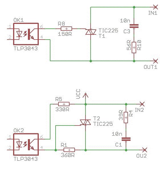-Zunächst einmal: Im Schaltplan ist in aller Unschuld Vcc eingetragen. Ist das etwa eine Gleichspannung? Da funktioniert ein Thyri/Triac nicht, so etwas braucht zum Wiederabschalten einen Nulldurchgang des Stroms.