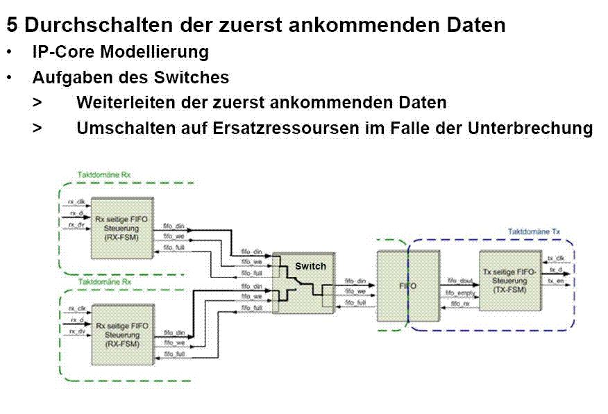 Hallo. PRP-Protokol. Ich habe folgendes Problem. Mit meinem FPGA empfange ich zwei identische Frames mit PHY1 und PHY2. Diese werden entcodiert und an FPGA durch MII weitergeschickt. Im Fpga befindet sich ein IP-Core (siehe Bild.), der aus zwei rx-Modulen, einem switch, einem FIFO und einem tx-Modul besteht. Die rx-Module empfangen die beiden identischen Frames und stellen diese dem switch-Modul zu Verfügung. Der switch- Modul erkennt, welcher der beiden Frames als erster angetroffen ist und leitet diesen in Richtung FIFO weiter. Falls es zu einer Unterbrechung der Datenempfang kommt(zB. durch Unterbrechung der Leitung am phy1), schaltet der switch-Modul taktsynchron auf rx2-Modul und leitet die Daten, die am PHY2 antreffen(die durch zweite Leitung beim FPGA-Board ankommen) zum FIFO weiter. Ich würde das "Taktsynchrone Umschaltung" nennen. Weiß jemand, wie so ein Umschalter in Verilog oder zumindest als digitale Schaltung zu Realisieren ist? (mit D-Flip Flops, Mux, FSM usw.) Oder gibt es einen guten Link mit digitalen Schaltungen für Probleme jeglicher Art? Dann könnte ich diesen switch-Modul einfach mit Verilog beschreiben. Danke schon mal im Voraus.