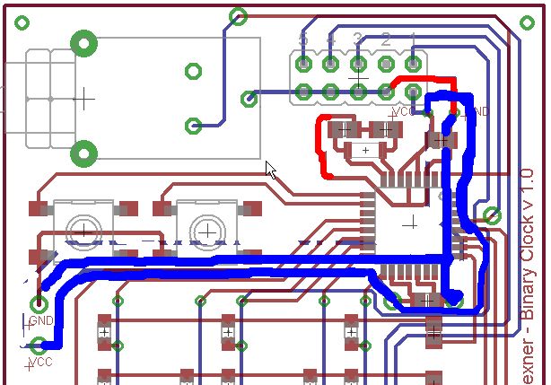 Also, ich habe mich jetzt mal an euren Vorschlägen versucht! Btw.: Ich habe heute das erste mal geätzt, um die optimale Belichtungs- und Ätzzeit herauszufinden, und es ist (beim 3. versuch ... -.-) dann schon ziemlich gut geworden. Am Freitag mach ich es dann nochmal, und da wird dass dann sicher hinhauen! :) Bezüglich Schaltplan: Siehe Anhang! Habe die Versorgungsbahnen verbreitert, einen 100 nF-Kondesator zwischen VCC und GND gehängt, und den Quarz habe ich durch folgenden Uhrenquarz ausgetauscht: http://at.rs-online.com/web/search/searchBrowseAction.html?method=getProduct&R=6480200 Ist die Schaltung jetzt so richtig? Vielen Dank für eure ganze Hilfe!! :) Lg Marc
