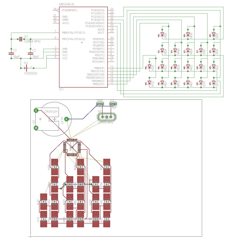 Jörg Wunsch schrieb: > Marc Brexner schrieb: >> und den Quarz habe ich durch >> folgenden Uhrenquarz ausgetauscht: > > Warum das eigentlich? > > Du müsstest dann mit einer ISP-Frequenz < 8192 Hz arbeiten, das > dauert ewig. > > Brauchst du denn überhaupt ein genaues Timing? Ansonsten lass den > ganzen Kram mit dem Quarz weg und nimm den internen RC-Oszillator. > Ob die LEDs nun 1 % schneller oder langsamer blinken, sieht doch > ohnehin keiner. Warum es genau sein muss? Das ganze wird eine binäre Uhr... Und da brauche ich nunmal einen Uhrenquarz....^^ > Auf Stromsparen (durch den langsamen Takt des 32-kHz-Quarzes) kommt's > vermutlich in einer LED-Schaltung auch nicht an, da genügt es dann, > die CPU im idle-Mode schlafen zu legen, wenn sie nicht gebraucht wird. Es ist so geplant: Es gibt einen Kipp-Schalter. Wird der umgelegt, wird Ground durchgeleitet, und am AVR als Flanke erkannt. Dadurch beginnt er, die aktuelle Uhrzeit über die LEDs auszugeben. Fallende Flanke -> LEDs aus. Der AVR rennt über Timer2 mit dem Uhrenquarz auf niedrigstem Verbrauch, und rechnet nur die Zeit dazu -> Alle 128 Overflows eine Sekunde. Also, er zählt, und geht dann wieder in den Stromsparmodus. Ich habe jetzt das aktuelle Schaltbild angehängt. Wie gesagt, etwas unvollständig... :( Lg Marc