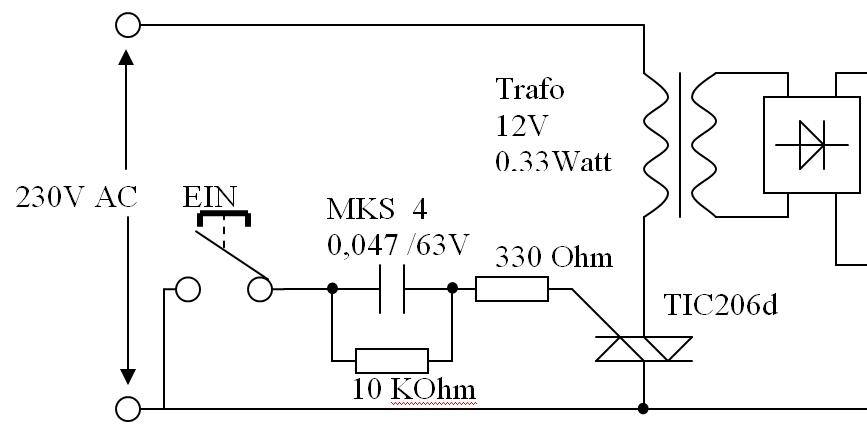 Hi, ich möchte einen Verbraucher von 0,33VA (kleiner Trafo) primärseitig schalten. Dabei möchte ich einen möglichst kleinen Strom schalten. Wie würdet Ihr das machen? 1)mit Triac und Diac 2)oder direkt mit einem Optokoppler mit Triac Ausgang, dann würde ich allerdings eine Spannung für die LED im Optokoppler brauchen.. Die Last ist an sich ja schon sehr klein. Ich weiß nicht wie groß der einschaltstrom sein kann...bin mir aber auch nicht sicher ob ein Triac ünberhaupt richtig druchschaltet bei so einer kleinen Last... Letztendlich möchte ich mit einem möglichst geringen Strom diesen Trafo einschalten... Hannes