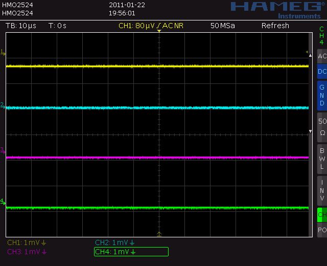 Nochmal ich, falls sich jemand mit dem HMO auskennt, im Anhang habe ich alle 4 Kanäle abgebildet, wobei alle per GND-Taste auf Masse gezogen sind. Bis auf den 2.ten Kanal sind bei den Nullpunktlinien bei den restlichen 3 Kanälen mehr oder weniger Abweichungen erkennbar, besonders bei Kanal 1. Gruß Gunb