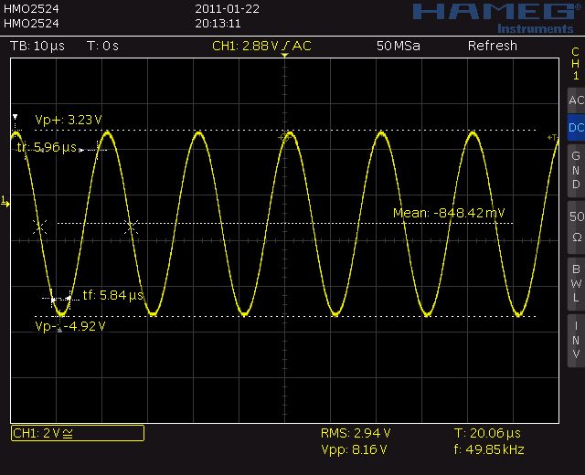 Hallo Jochen, das Scope war zum Zeitpunkt der Screenshots schon mehrere Stunden ohne Unterbrechung an, Temperaturdrift also ausgeschlossen. Temperatur um die 20°C, also normal. Ja, der Versatz ist in allen Teilerstellungen bis auf 5V/DIV konstant. Beim Umschalten von 2V/DIV auf 5V/DIV kann ich ein wenig Zusammenrücken beider Linien erkennen, dies gilt für alle Kanäle. Kannst du bei dir denn auch einen Offset zwischen der jeweiligen Nullpunktlinie und der GND-Linie erkennen oder sind sie bei dir identisch, wenn du die GND-Softkey-Taste drückst? Im Anhang kannst du mein Problem erkennen: obwohl der Sinus symmetrisch ist, also offsetfrei, weichen Maximum und Minimum betragsmäßig voneinander ab. Eigentlich müssten aber beide 4V sein, da aber von der nicht offsetfreien Nullpunktlinie aus gemessen wird, ensteht der Fehler bei Maximum und Minimum. Bin eigentlich sehr zufrieden mit dem Gerät, aber das genannte Problem ärgert mich doch etwas. Gruß Gunb