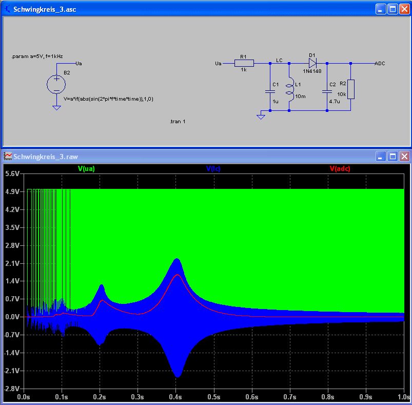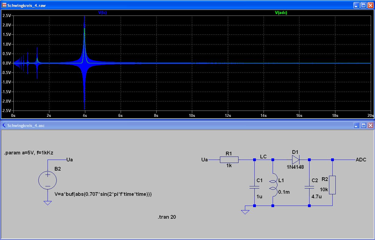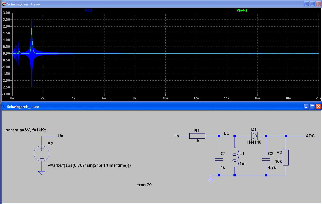 Bobo schrieb: > deine Idee ist toll... Nicht wahr, wenn man sie mal verstanden hat... ;-) Ich habe dir das mal simuliert: der uC gibt eine Rechteckspannung aus, und dann kommt der Schwingkreis und ein simpler Gleichrichter... Da sieht man an den "kleinen" Maxima schön die Oberwellen des Rechtecks, die aber nicht weiter stören: der stärkste (aka. Grundfrequenz) gewinnt. > Mir gefällt blos nicht das ich dann die Frequenz und die Amplitude > messen muss. Ich bin der Meinung der Mega mag Frequenzzählen nicht so... Ähmmm.... Du gibst die Frequenz mit dem uC doch aus. Dann mußt du sie doch nicht messen, du kannst sie ganz einfach berechnen... :-o