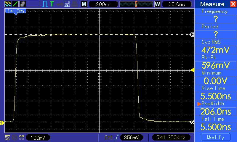 es gibt eine möglichkeit die Tekway/Hantek DSOs ein wenig zu tunen. Die bandbreite wird normalerweise über den VAG opamp und den digital filter reduziert (basierend auf model name wird der filter und vag opamp gesteuert). Glücklicherweise hat Tekway von anfang an (wohl für eigene test und kalibrierungszwecke) eine möglichkeit eingebaut den digitalen filter zu manipulieren. Was natürlich nicht geht (ohne jetzt herum zu patchen) is die verstärkung des vag opamps anzupassen um den frequenzgang flach zu halten. Erstellt man eine "tst" file direkt im root verzeichnis mit z.b. "[filter] 45" wird dann der digitale filer erst ab 450Mhz greifen. Mehr als 45 macht sowieso wenig sinn da die ADCs es nicht mitmachen werden. Es ist kein echtes xxx MHz bw hack, eher eine erweiterung falls man mal solche signale messen muss und sonst kein anderes equipment hat. Die abschwächung liegt dann auf -6db beim 250MHz, -9db beim 300MHz, und -15db beim 400MHz. Auch wenn ein 400MHz signal nicht schlechter aussieht wie ein 200Mhz, es macht wohl sinn nur im avg. mode zu messen. Der trigger, die autoset funktion und der hardware freq. counter funktionieren ebenfalls ohne weiteres beim 400Mhz. Andere funktionen wie messungen oder FFT natürlich auch. Ahja, man muss natürlich den scope neu starten damit die "/tst" file übernommen wird. Es macht sinn diese änderung über die shell zu machen, die dso.exe killen, tst file erstellen und /dso.exe starten. Es d+rfte gleich am anfang eine staus meldung sichtbar sein "get corner freq ID =45 from filetst ok" Auf dem Bild, 400MHz 0db signal auf 50Ohm load, wie man sieht abgeschwächt um -15db. Ohne diese manipulation sind vom 300Mhz signal nix mehr zu sehen auf einem 200MHz scope. EDIT: so ähnlich arbeiten die Instek und Rigol DSOs, nur dummerweise durch die art des OS sind die nicht einfach zum patchen.