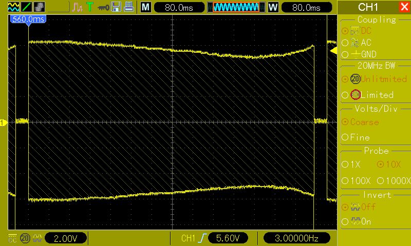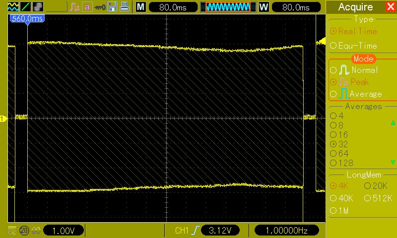 Gerd E. schrieb: > > Das habe ich mal ausprobiert, das Original-Signal und das von CSV wieder > geladene anbei. Das von CSV geladene Signal hat dabei doch ein wenig an > Aussagekraft verloren... :( > > Dabei habe ich das Scope extra nur auf 40K gestellt. die eingestellte speichertiefe ist erst mal egal. Beim csv sind es raw ADC daten und so werden die auch wieder dargestellt, das ist auch richtig so. Schöner wäre evt. eine funktion um die neu berechnen zu lassen (damit auch die kanten glatt sind), dafür ist der recorder aber eigentlich da. > > Das mit dem Referenzsignal für Math benutzen habe ich so versucht: > > - Eingangs-Signal an CH2, Utility-Record-rec, End Frame 1, Start > - Math CH1-CH2 an > - Eingangs-Signal an CH1, Utility-Record-play, Repeat, Start > > Beim Play geht aber CH1 aus und das Scope von Run in Singleshot, ich > kann also nicht das Ref-Signal im Hintergrund laufen lassen und > gleichzeitig kontinuierlich das aktuelle Signal von CH1 plus die > Math-Kurve aus den beiden Signalen sehen. > > Gibts da noch irgendeinen Trick um das zum laufen zu kriegen? > mit dem recorder kann man längere daten speichern, so wie die auch anzegeit werden (mehr oder weniger, perfekt ist es nicht). Will man etwas von den daten als ref signal benutzen, dann muss man einfach die entsprechende frame laden , abspielen und als ref abspeichern. Danach geht math ch1+ch2 und refa oder refb gleichzeitig (und run mode) > Noch eine Kleinigkeit: wenn ich Auto drücke und nen Signal dranhängt > kommt unten ne gelb hinterlegte Zeile mit einigen Measure-Infos. Sobald > ich in irgendein Menü gehe verschwindet die wieder. Kann man die > irgendwie dauerhaft anschalten? Ist ganz praktisch wenn man das > Measure-Menü nicht offen haben will. > nein. Auto hat im prinzip zwei anzeigen, die gelbe unten (falls signalfolge erkannt würde) und rechts (falls singal eine unbekannt/random form hat). Beide werden dummerweise ausgeblendet wenn man irgendwelche menus wählt, es klingt auch logisch da man im prinzip die auto werte "verändert". Grundsätlich würde ich gerne diese gelbe anzeige als frei zuschaltbare measure anzegie sehen wollen, evt. krigen wir es gebacken mit einem firmware "patch", out of the box ist es leider nicht drin.