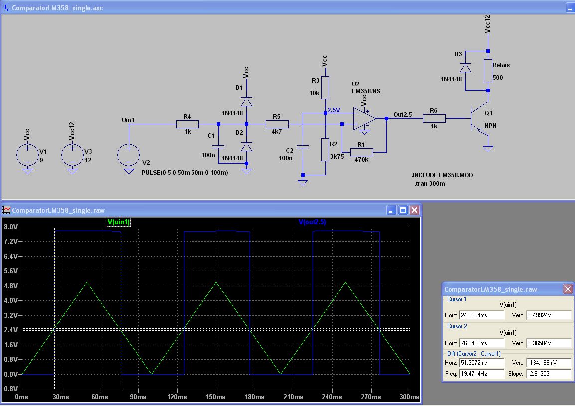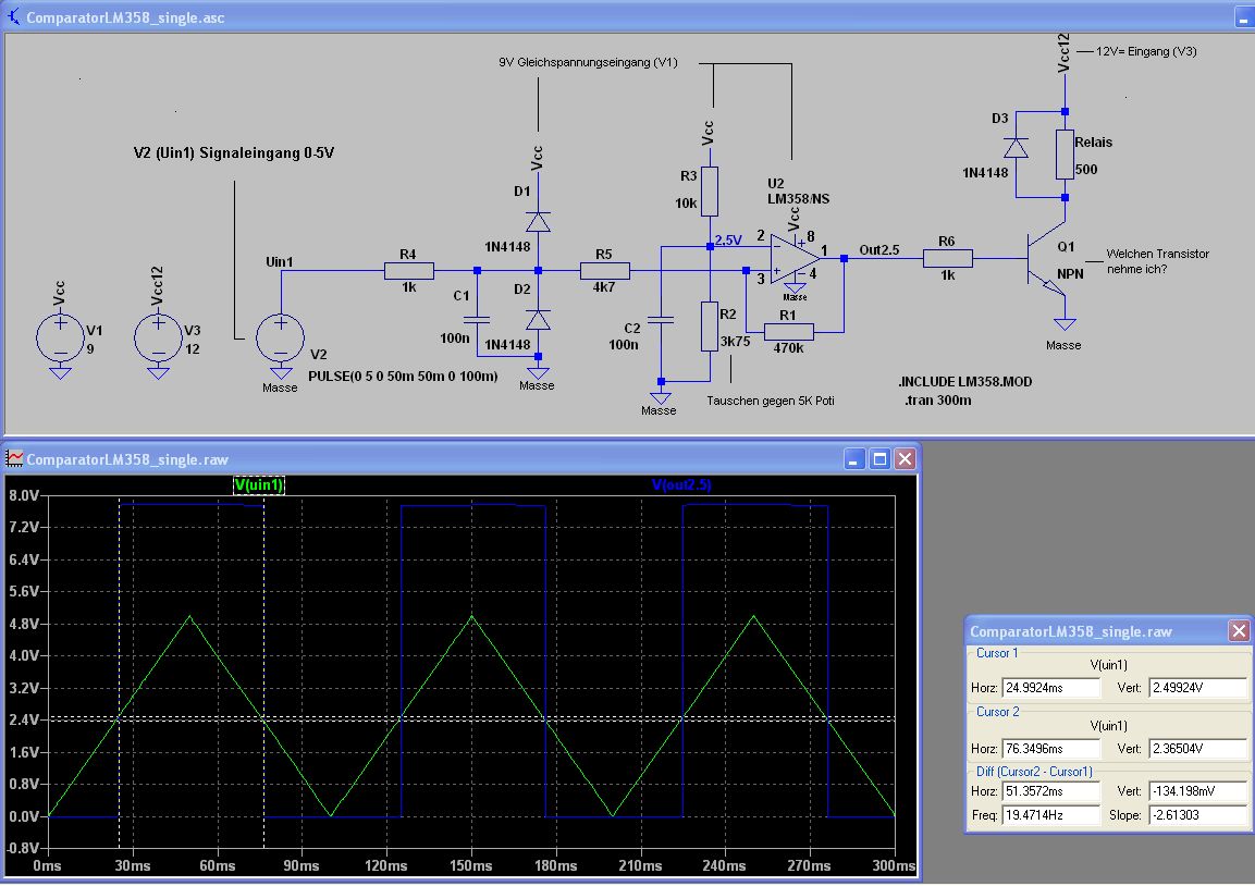 BMK schrieb: > Weiterer Vorteil des TS912 als CMOS Teil: Eingang ist very hochohmig. Aber Obacht im Auto: very hochohmig bedeutet auch very anfällig und sensibel auf Störungen... :-o Da wäre dann eine entsprechende Schutzbeschaltung kein unnötiger Luxus... Ich habe hier mal eine Simulation mit dem LM358: Einschalten bei 2,5V und Ausschalten bei 2,35V. Ich würde in der Praxis den R2 als 5k Poti ausführen, denn die 2,5V Referenz hängen ja an der 9V-Versorgung des Opamps, und Spannungsregler können da schon mal um +-5% abweichen...