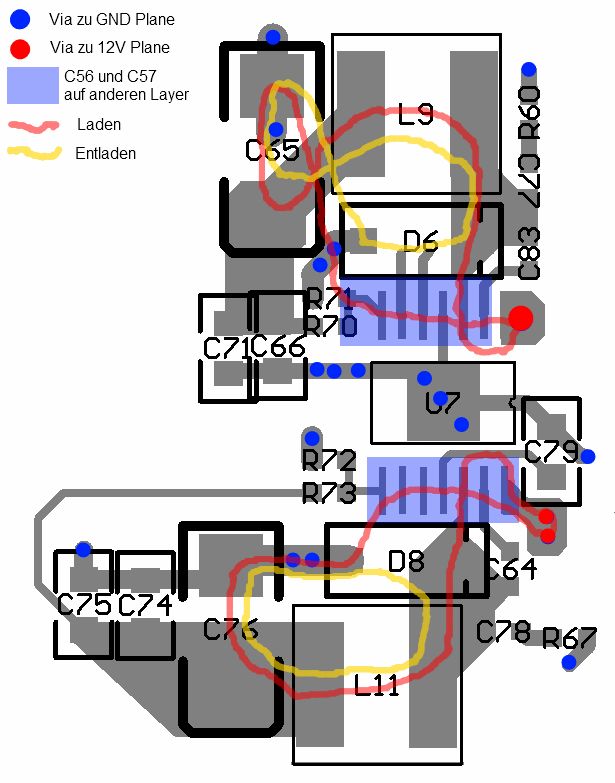 Hallo Lothar, ich habe jetzt mal dein Vorgehen von deiner Website verfolgt. Das im Anhang ist dabei herausgekommen. Da sieht man gut, dass der Entlade-weg für die 1,2V besser liegt als bei der 2,5V. Auch die schon von dir angesprochenen C71 und C66 liegen mehr als ungünstig :( Nun ja, ich werde mir diese Methode angewöhnen und immer in meine geplanten Layouts einzeichnen, bevor (!) ich sie herstellen lasse. Nun habe ich aber immer noch diese teure PCB mit dem Layout vor mir und muss eine Lösung finden, wie ich die 2,5V zum Spielen bekomme. Ich könnte also erstmal C71 und C66 direkt parallel zu C65 löten, damit wäre dieser Weg nicht versperrt. Oder gibt es noch andere Maßnahmen, die ich vorerst treffen könnte? Noch eine Frage: Auf meiner Testplatine hatte ich aus Jux und Dudelei, einfach weil ich Platz hatte, einen 100uF an den 12V Eingang gehängt. Diesen konnte ich aus Platzgründen nun nicht mehr unterbringen. Die 12V sind aber an anderer Stelle (direkt am Eingang) ausreichend gestützt. Könnte das noch eine Fehlerquelle sein? Vielen Dank! Andi