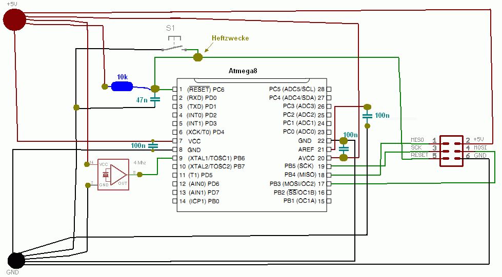 Da ich mir nicht ganz sicher bin, ob ich die Programmierschaltung aus dem Tutorial richtig verdrahtet habe, habe ich mal eben eine eigene Zeichnung des ganzen angefertigt(so wie ich die Verdrahtung verstehe). Wäre echt hilfreich, wenn ihr euch das mal ansehen und sagen könntet ob das so passt? Ist eine etwas eigenwillige Zeichnung, aber so versteh ichs nun mal. Bitte nicht über das Aussehen der Zeichnung, oder die "Heftzwecken" die Kontakte darstellen sollen beschweren. Einfach nur ob die Schaltung korrekt aufgebaut ist oder nicht. Und falls nicht, dann einfach sagen was wo nicht passt :-) Ich hoffe, dass ich das richtig kapiert habe :-)