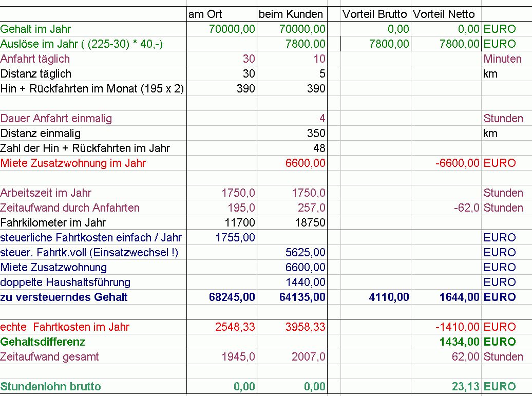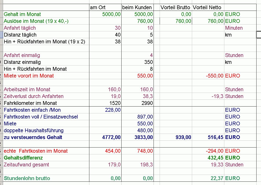Hier habe ich nochmal eine Auswertung fürs ganze Jahr gemacht und den Nettosteuervorteil nach Abzug der Miete und der voll gerechneten Fahrtkosten wegen Einsatzwechseltätigkeit eingesetzt: Alle 2 Wochen wir heimgefahren und auch abgerechnet. Auch die 3 MOnate Begrenzung des Verpflegungsmehraufwandes sind exakt drin. Also keine Steuertricks oder illegales. Raus kommen (unabhängig vom Gehalt) 20,- die Stunde netto bezahlte Anfahrt.