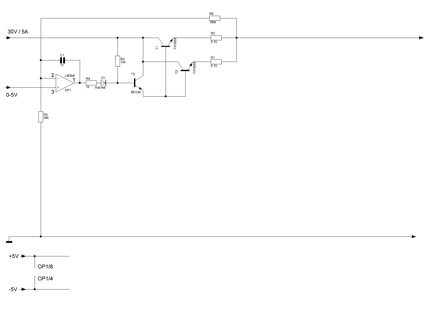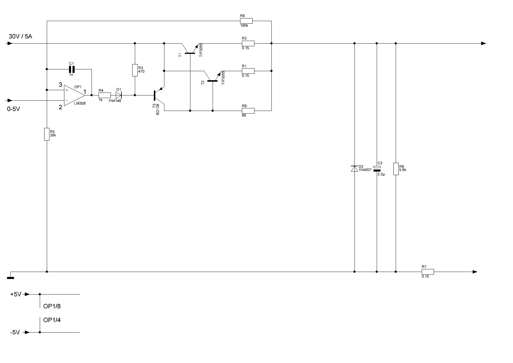 > Na wenn ich mit meinem Trafo 25V/6,5A maximal auf 21V komme. Man kann es halt geschickter oder ungeschickter aufbauen. > Wenn ich einen OPV mit +-12V versorge, kommt der doch maximal > auch auf 12V am ausgang. Nur gute OpAmps R2R. Sonst eher 9.5V. > Wie bringe ich dann die regelung dazu, auf 25V zu kommen ? Hast du den angegebenen Link zur d.s.e FAQ nicht gelesen ? Da stehen die üblichen Labornetzteilschaltungen drin. Und auch hier im Forum gibt es Threads die das ellenlang mit Beispielschaltungen durchkauen. Ein 5-stufiger Emitterfolger (wenn man die Transistoren im OpAmp mitzählt) ist jedenfalls kontraproduktiv.