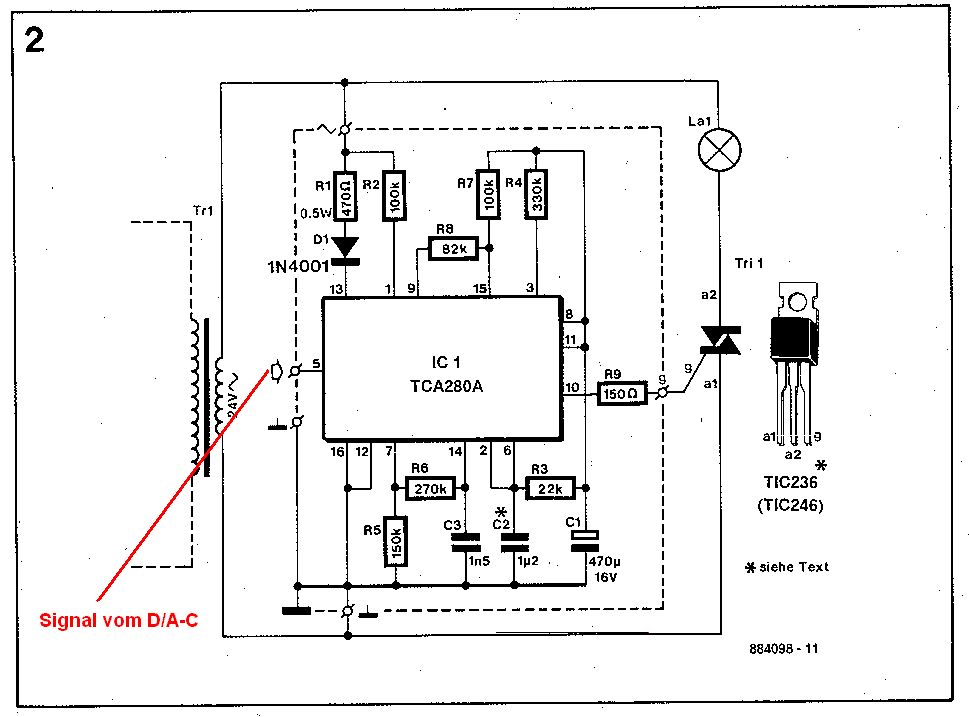 Ich habe da nochmal was als Schaltplan, aaaaber der TCA280A ist so alt uns teuer... wie kann man das denn (möglichst genau so) mit heutigen Bauteilen aufbauen ?? Und : was ist die gestrichelte Linie im Plan ? LG Frank