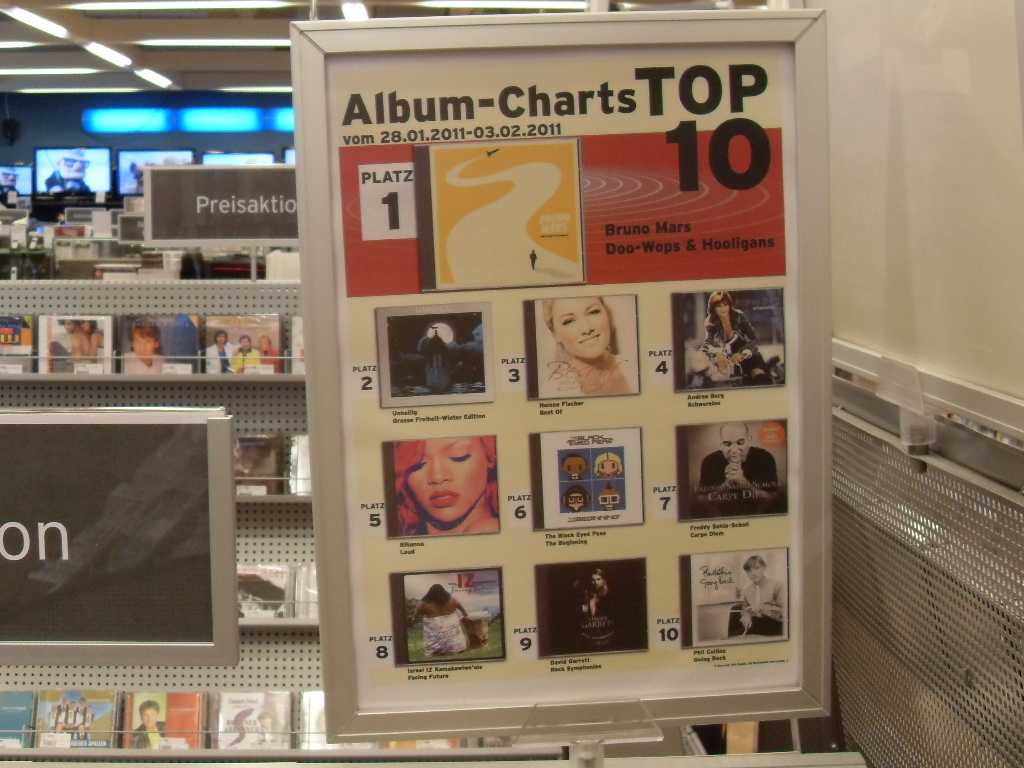 Ich habe am Wochenende dieses bei Karstadt in der Plattenabteilung geknipst. Wer zum Teufel ist Bruno Mars fragte ich mich, wer hat das gekauft, wie kann das auf Platz 1 sein? Geht das noch mit Rechten Dingen zu, oder wird hier von Seiten der Musikindustrie massiv manipuliert?